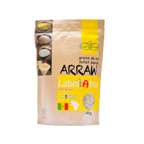 Dans une marmite , mettre un litre d’eau puis ajouter une bonne pincée de sel . Quand l’eau arrive à ébullition , verser le « Arraw » en pluie. Laisser cuire pendant au moins 30 minutes à feu moyens en remuant de temps en temps pour éviter la formation de grumeaux . n’hésiter pas à rajouter de l’eau car en s’épaississant , la pate absorbe l’eau . La pate est cuite lorsque les petites grains de mil sont fondants .