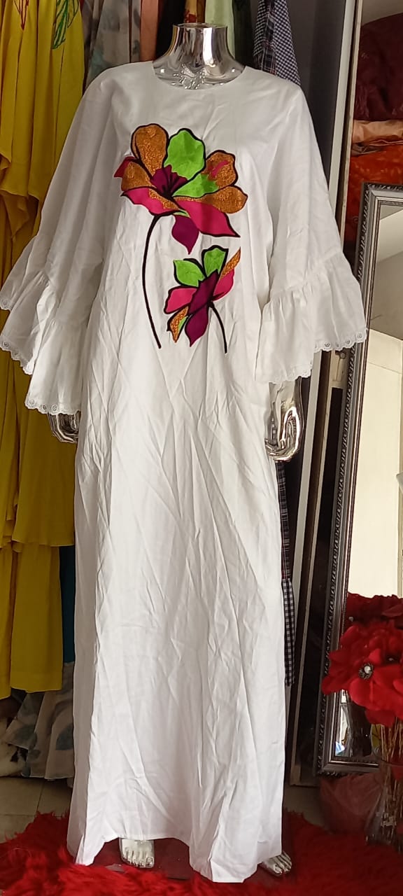 robe blanche en coton avec broderie multicolors petit fil manche large adéquoit pour l’étéé